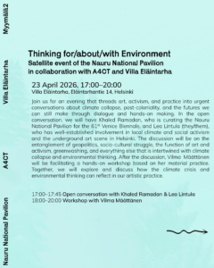 Presented as a satellite event of the Nauru National Pavilion for this year’s Venice Biennale, in collaboration with A4CT, Villa Eläintarha, and sponsored by Myymälä2 cooperative. All welcome.